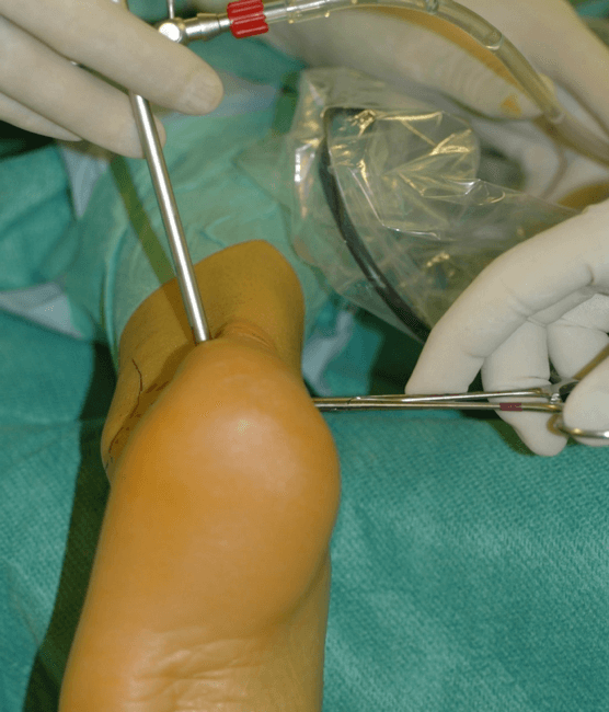 Voies d’abord chirurgicales (ici un pied gauche). L’arthroscope est introduit parallèlement au grand axe du pied jusqu’au contact de l’os. Dissection « mousse » du coté interne jusqu’au contact du mandrin.