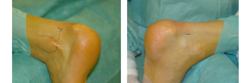 Le Dr Jacques Vallotton (JV) opère ses premiers patients en 1999 par une voie ouverte rétro-malléolaire interne de 4 à 5 cm. L’accès au tendon en profondeur est malaisé et il faut prendre garde à ménager la branche calcanéenne du nerf saphène interne.