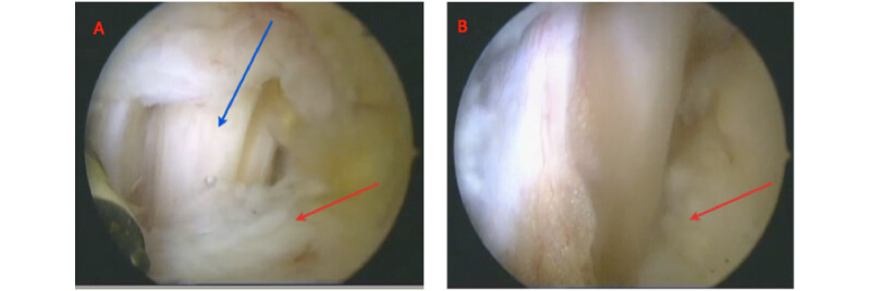 Vues arthroscopiques montrant le tendon du FHL et de la poulie qui cravate le tendon en arrière. Flèche bleue: Tendon du FHL. Flèche rouge: Poulie fibreuse